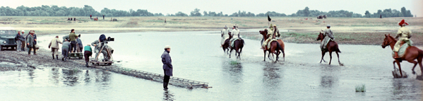 – A także – mówi kierownik produkcji „Potopu” Wilhelm Hollender – właściwie losy filmu, bo przecież ta finałowa batalia jest kluczową sekwencją ekranowego „Potopu”. Pole bitwy zostało wybrane już w roku 1970, gdy po wstępnych rozmowach w przedsiębiorstwie Sovinfilm, w Moskwie, zostaliśmy skierowani nie tylko do Wytwórni Biełaruśfilm, ale także do Wytwórni im. Dowżenki w Kijowie. Udaliśmy się tylko we dwóch z Hoffmanem na przejażdżkę po Dnieprze. Wiedzieliśmy, czego szukamy. Powiedzieliśmy o tym także kapitanowi naszego statku. Zapalił się. Przybijał wielokrotnie do brzegu, pokazywał nam różne miejsca. I w końcu znaleźliśmy to, o którym marzyliśmy; otwarte pola, bród, przez który miał się przeprawić Kmicic i Tatarzy, miejsce na zbudowanie mostu. Brzeg był wysoki, ale to nam nie przeszkadzało, bo widzieliśmy w tym jeszcze mocniejszy efekt filmowy. Pochodziliśmy z godzinę po tym polu, pooranym odnogami Dniepru, a następnego dnia ruszyliśmy tam znów, tyle że już z Leonidem Koreckim, kierownikiem produkcji Wytwórni im. Dowżenki, a później także naszym najbliższym współpracownikiem. Zapadła decyzja, że właśnie tutaj, w odległości 40 kilometrów od Kijowa powstanie nasz obóz, nasza baza. Natychmiast złożyliśmy w Sovinfilmie zamówienie na korzystanie z usług słynnego kawpołku. Gdyby to zamówienie zostało złożone później, strona radziecka nie mogłaby nam już przyjść z pomocą. Kawpołk wykorzystywany jest bowiem w wielu filmach radzieckiej produkcji, a portfel z zamówieniami na jego usługi dosłownie pęka.